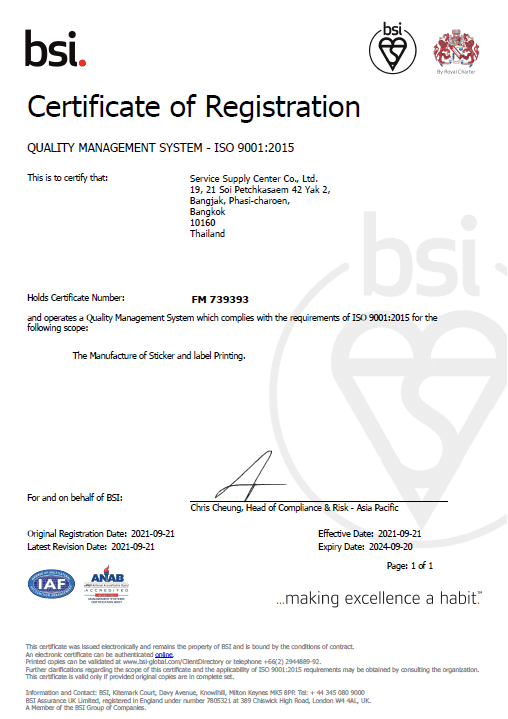บริษัท เซอร์วิส ซัพพลาย เซ็นเตอร์ จำกัด รับพิมพ์งานสติกเกอร์ทั้งระบบม้วนและแผ่น ด้วยเครื่องจักรที่ทันสมัย และประสบการณ์ในธุรกิจโรงพิมพ์มาเกือบ 30 ปี ทำให้เราสามารถผลิตงานที่มีคุณภาพ และเป็นที่พึงพอใจของลูกค้ามาอย่างยาวนาน ภายใต้ระบบบริหารคุณภาพ ตามหลักมาตราฐานสากล ISO 9001:2015